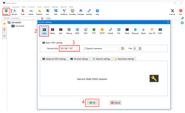 6、Open Mobaxtermand click“Session”,and click“SSH”,inset the raspberry pi IP into Remote host and click“OK”