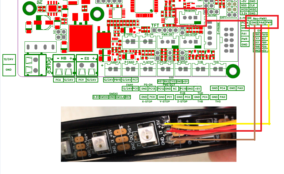 - D8 green light for the hot bed HB status indicator: always on when heating, off when not heating.