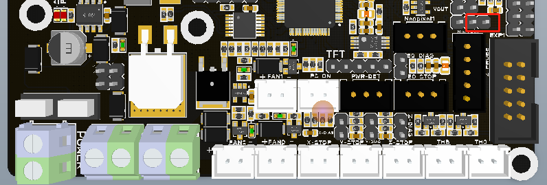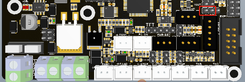 2、To use an external BIGTREETECH DCDC5V V1.0 module, short the pins shown in the above image using a jumper.