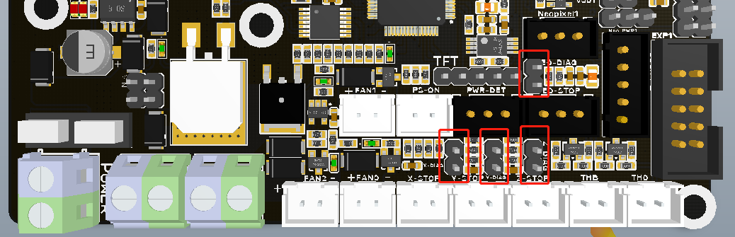 As shown, connect the corresponding axes with the jump caps to choose Sensorless homing function.