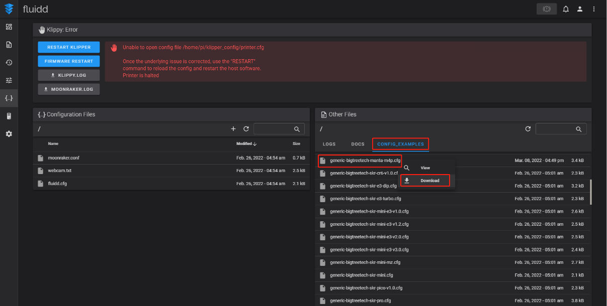 - Enter your device IP address into your browser to open the webUI,find the reference config for motherboard in the directory shown below,if there is no such config available, update your klipper source code to the newest version or download from github: https://github.com/bigtreetech/Manta-M4P
