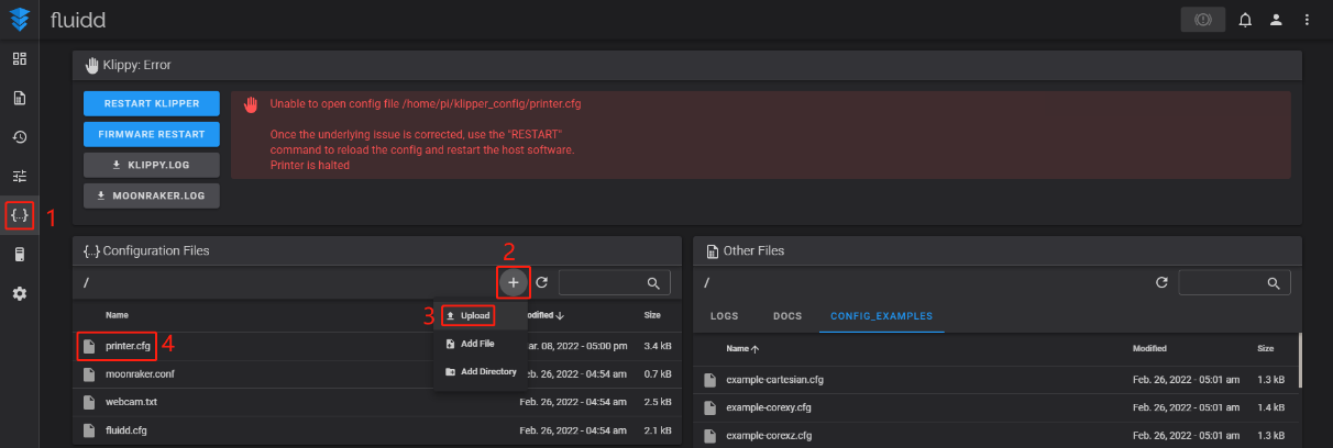 - Upload your finished config file into Configuration Files, and rename to “printer.cfg”