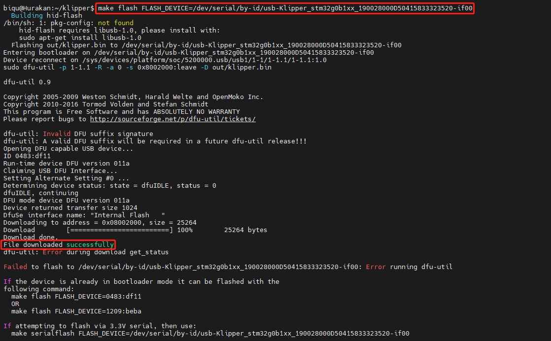 Compile with the configuration shown below(if the options below is not available, please update you Klipper source code to the newest version) * [*] Enable extra low-level configuration options * Micro-controller Architecture (STMicroelectronics STM32) ---> * Processor model (STM32G0B1) ---> * Bootloader offset (8KiB bootloader) ---> * Clock Reference (8 MHz crystal) ---> * Communication interface (USB (on PA11/PA12)) --->