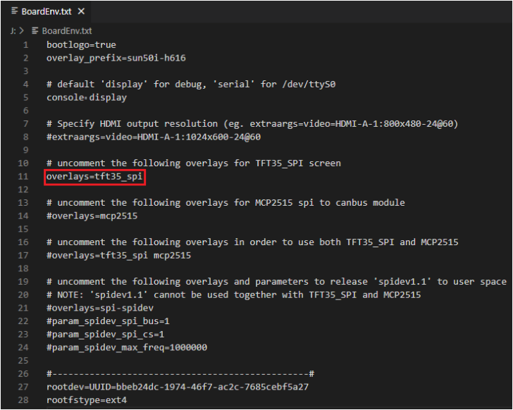 NOTE: If the OS image of v2.2.1 version is used. Set to overlays=tft35_spi25 instead of overlays=tft35_spi Use the SPI speed of 25Mhz instead of the default 50Mhz to avoid display confusion. If the OS image after V2.2.1 is used, The OS will use a lower and more stable speed by default.