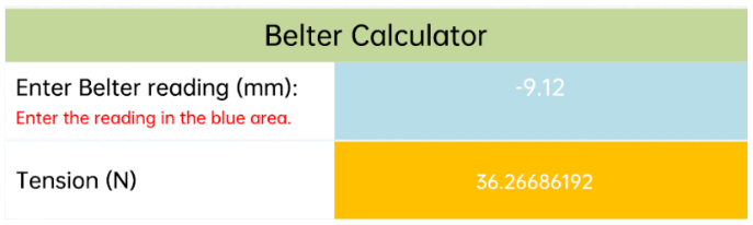 Tension calculation table of Belter value-tension converters to assist users in converting readings into belt tension (N).