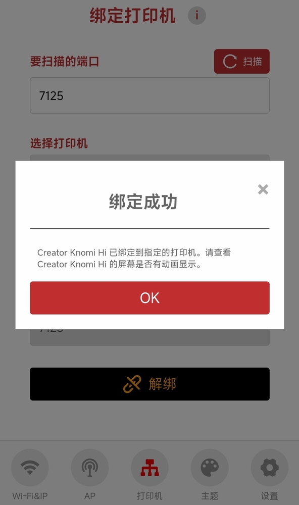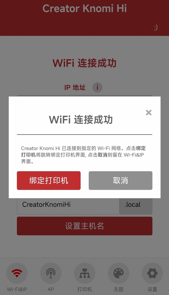 绑定, 开始连接打印机, 出现绑定成功的弹窗意味着Creator Knomi Hi已经成功连接到打印机了。