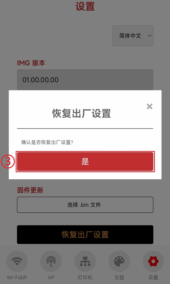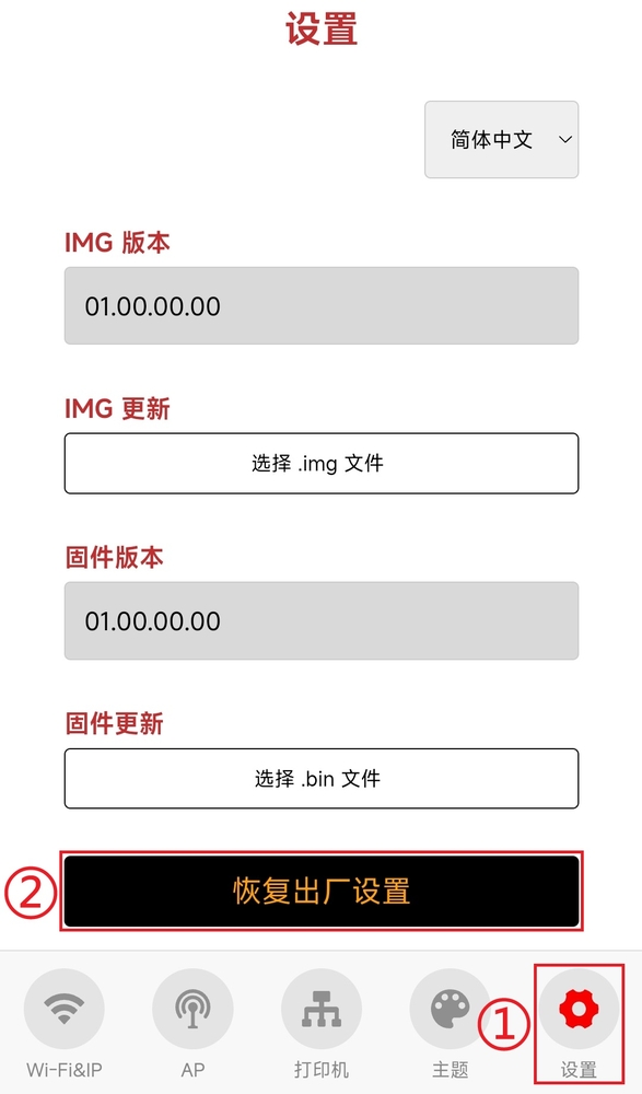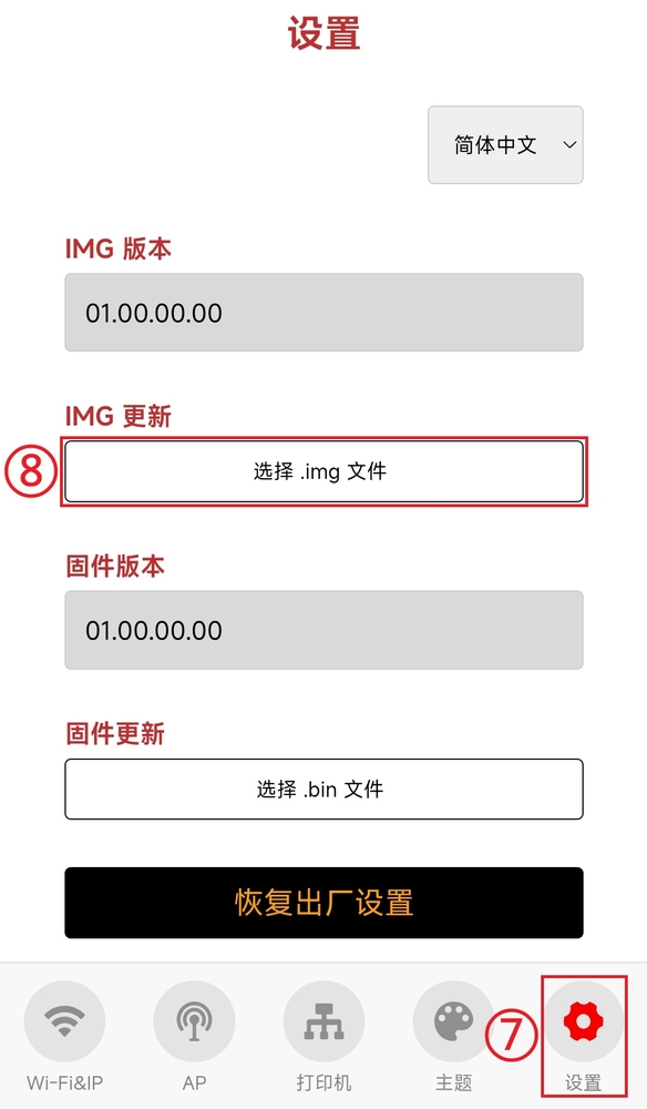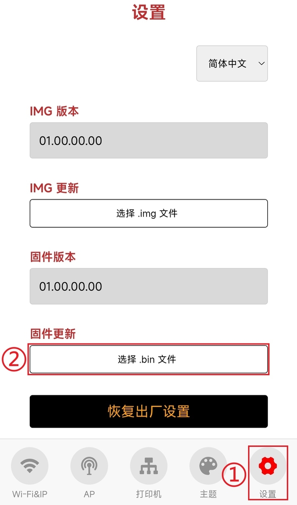 设置界面, 点击 ②选择 .bin 文件, 然后选择要更新的固件, 更新完成后设备会自动重启。