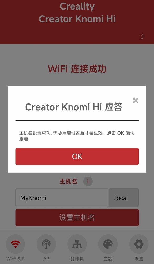 设置主机名将设置的主机名发送给 Creator Knomi Hi,若出现如下图中的弹窗,说明主机名已经重新设置成功,主机名修改后需要重新启动才可以生效,直接点击弹窗中的OK按钮,Creator Knomi Hi 会立刻重启,若我们不想立刻重启,可以点击弹窗右上角的x按钮关闭弹窗。