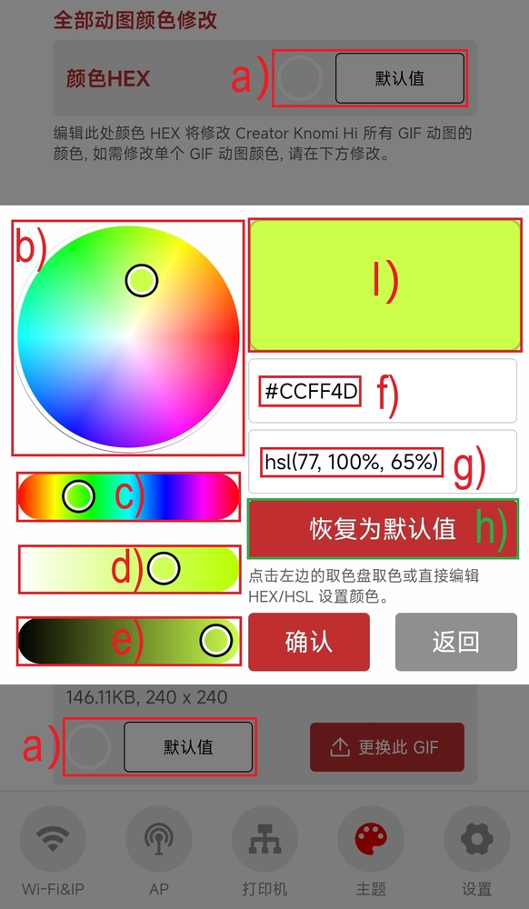 - f) 颜色对应的RGB 的16进制值,16进制下每个值的范围均为 0255(0x000xFF), 可以直接修改此处的值来得到想要的颜色。 如图中所示的 #CCFF4D 意味着: