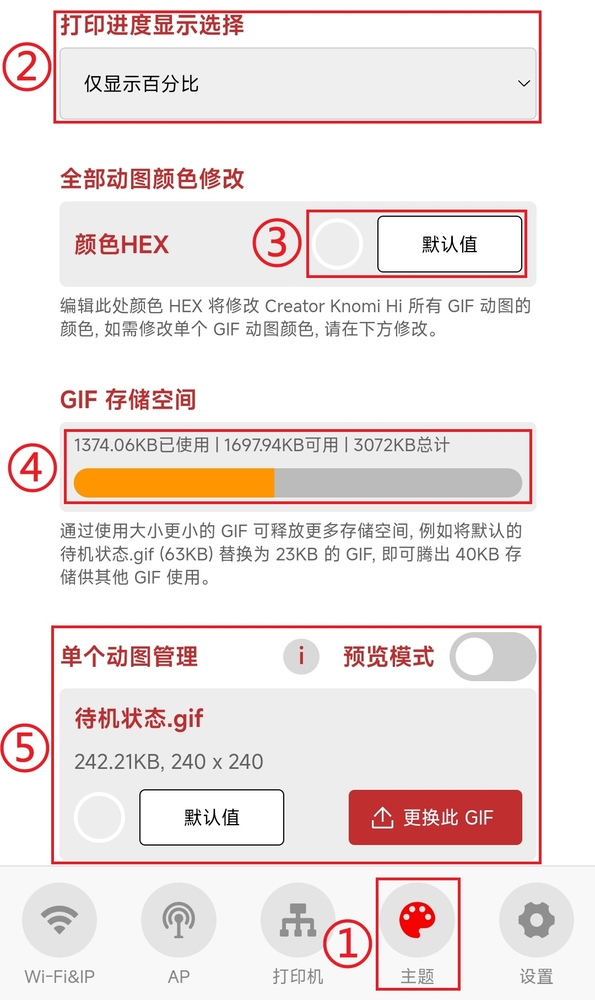 - ④ 查看GIF 储存空间用量,由于 Creator Knomi Hi 硬件的限制,所有的 GIF 大小之和不能超过 3MB (3072KB,1MB=1024KB),超出此大小 Web UI 会阻止更新并弹窗提醒。