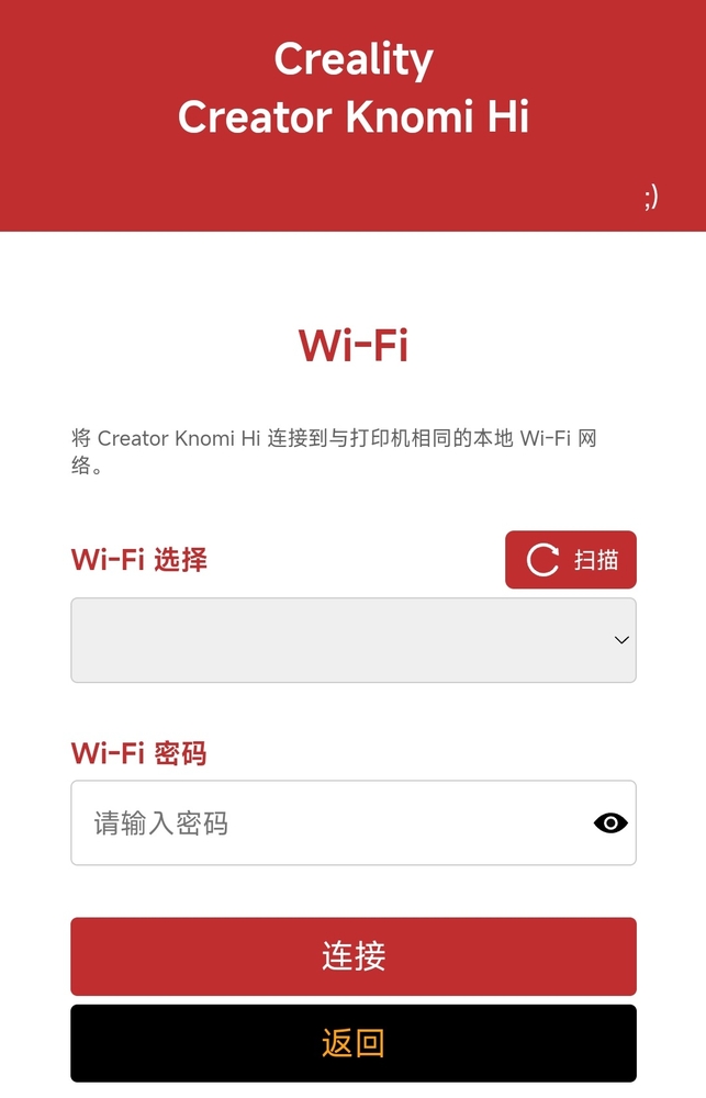 - 进入连接 Wi-Fi 界面,Creator Knomi Hi会自动扫描环境中的 Wi-Fi,请选择打印机所连接的 Wi-Fi 进行连接。如果没有扫描到打印机连接的 Wi-Fi, 可以点击 “扫描” 按钮重新扫描。