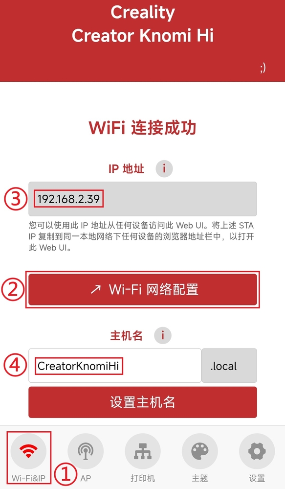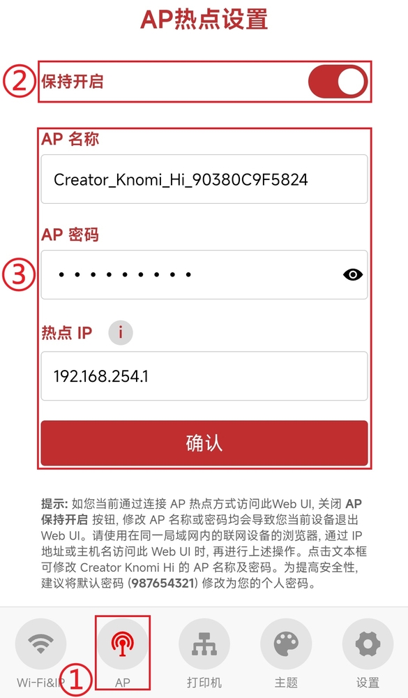 AP界面 - ② 打开/关闭 Creator Knomi Hi 的 AP 热点。关闭AP热点后将无法连接到 Creator Knomi Hi 的热点去访问 Web UI,关闭前请务必记录 Creator Knomi Hi 在其所处的 Wi-Fi 的IP,以便使用同一 Wi-Fi 的设备通过 IP 访问 Web UI。