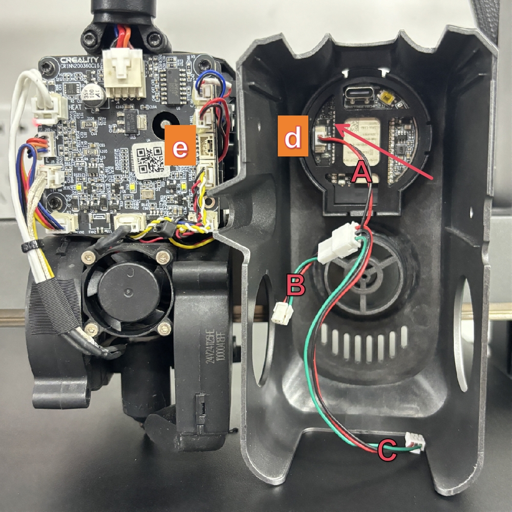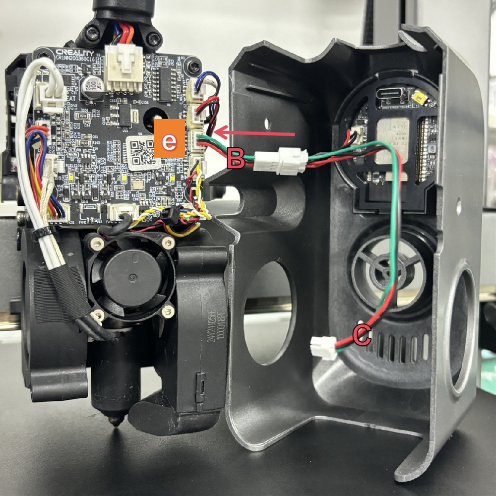 ②将线缆B的接口插入Creality Hi打印头控制板上的e口。