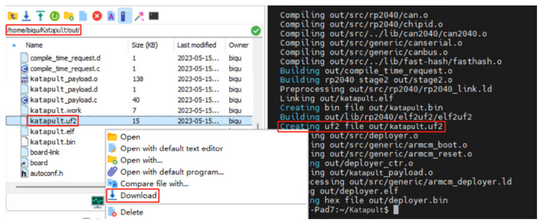 3.输入make编译固件,当make执行完成后会在 home/biqu/Katapult/out 文件夹中生成我们所需要的‘canboot.uf2’固件,在SSH软件左侧可以直接下载到电脑中。