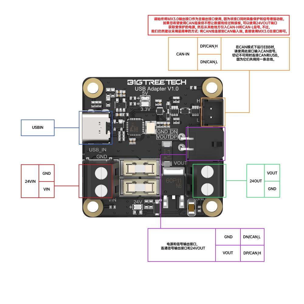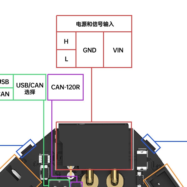 需要注意的是:螺丝端子只能用于CAN连接,USB连接必须使用配套的屏蔽线缆。