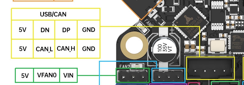 重要提示:FAN0和FAN2的电压选择跳线虽然相邻,但跳线引脚顺序是相反的。这是我们为了确保两路风扇都能获得足够宽的供电走线而做的特意设计。请务必为您的风扇选择正确的电压,否则可能会烧毁风扇,这种情况BIGTREETECH概不负责。