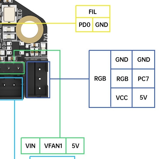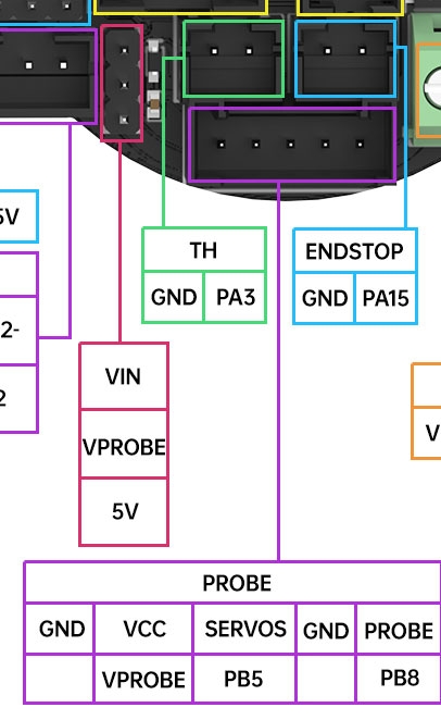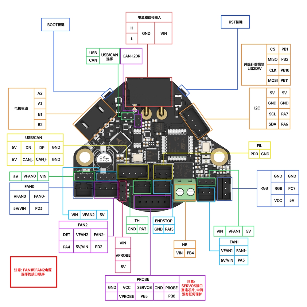 | 拓展接口 | Probes (Multiplexed Microprobe, BLTouch, 24V Probe port), RGB, TH, motors, USB/CAN expansion ports等 |