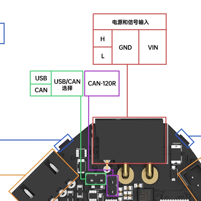 两种通信接口都需要配合转接板使用。切记不可同时连接CAN接口和USB接口,否则可能损坏您的主控设备。使用USB接口时,直接连接到USB-C端口即可;使用CAN接口时,请使用JST-XH端口。无论哪种方式,都需要同时接入24V电源。