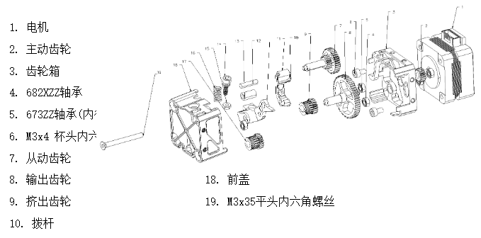 挤出齿轮的松紧可调节,以适应不同的耗材,逆时针方向转动螺杆为夹紧,顺时针方向转动螺杆为松弛(当螺杆停止转动时,请勿用力,以免造成挤出机损坏)