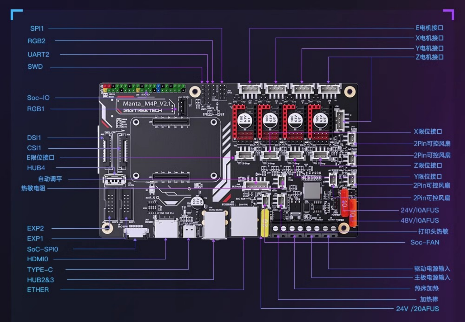 | 风扇端口 | 三个用于CNC风扇(24V/5V电压可选),一个SoC风扇(电压不可选) |