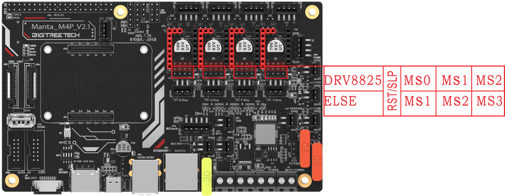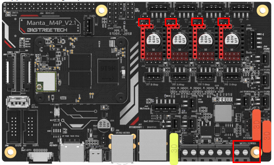 例如,TMC2208、TMC2209、TMC2225…每个都使用一个跳线帽连接图中红框的位置,细分和驱动器电流由固件设置。