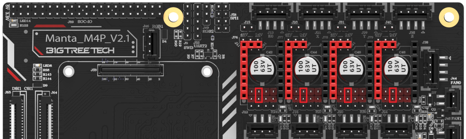 例如,TMC2130、TMC5160、TMC2160…每个使用4个跳线帽连接图中红框的位置,细分和驱动器电流由固件设置。