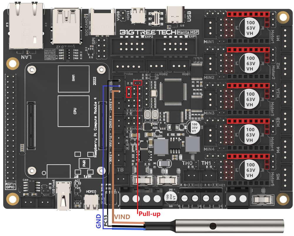 BIGTREETECH MANTA M5P通电后,MCU左侧的红灯D22将亮起,表示已通电。当仅使用USB为板供电或通过USB供电时,请将跳线帽插入VUSB。