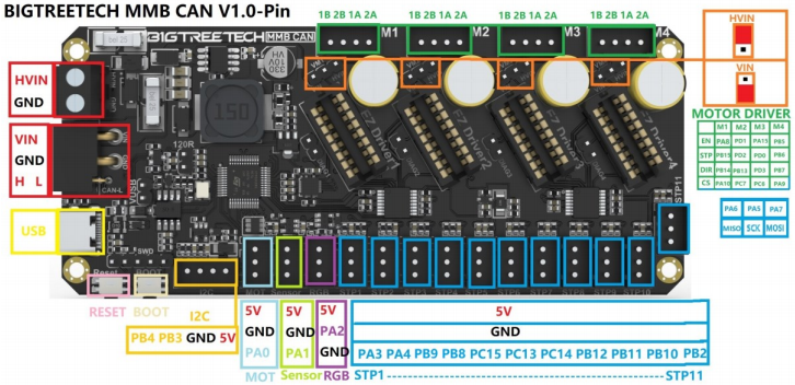 BIGTREETECH MMB CAN V1.0 是必趣创新科技(深圳)有限公司 3D 打印团队针对多色挤出机制作的挤出控制板,可以通过 USB 或者 CAN 进行通讯,大大简化接线。