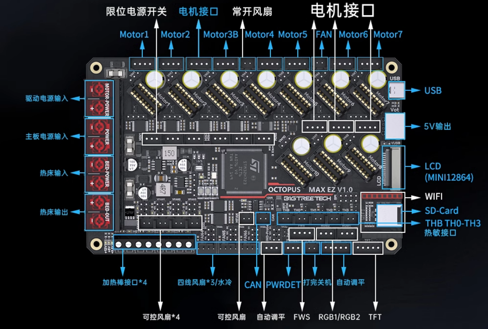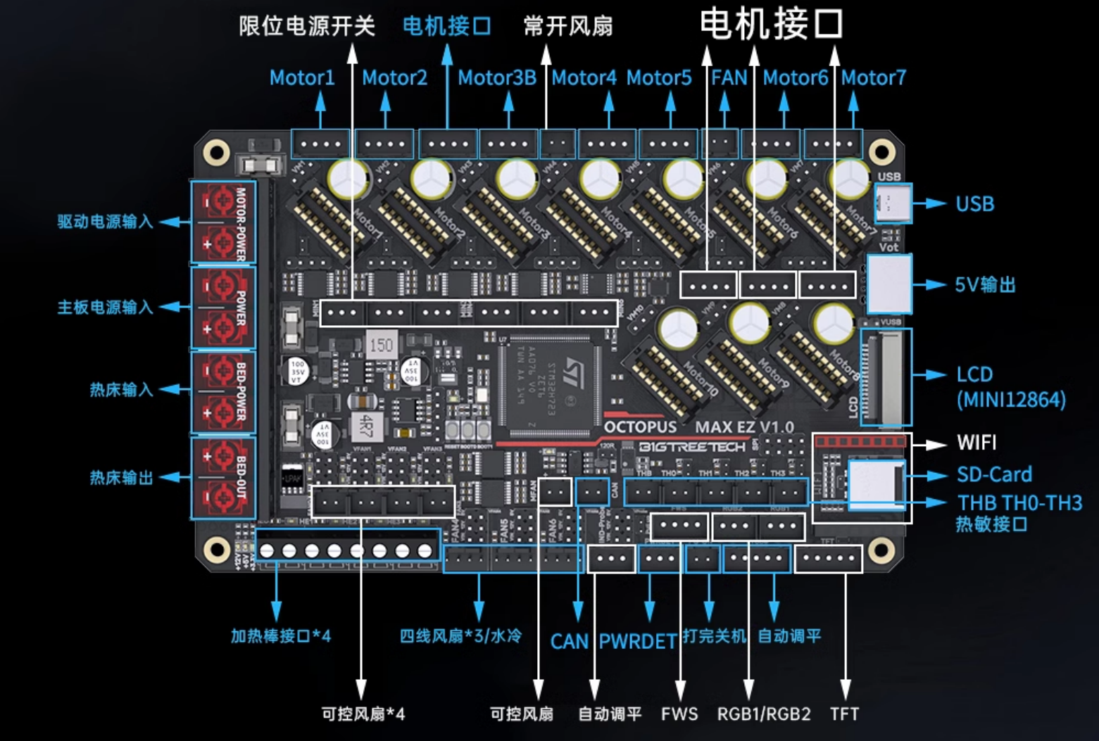 | 拓展接口 | BLTouch(Servos、Probe)、PS-ON、FWS、PWRDET、 RGB*2、SPI、IND-Probe、CAN、WIFI、TFT |
