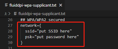 2、在SD卡的boot盘中找到“fluiddpi-wpa-supplicant.txt”或者“mainsail-wpa-supplicant.txt”文件,用VSCode打开(不要用windows自带的记事本打开)