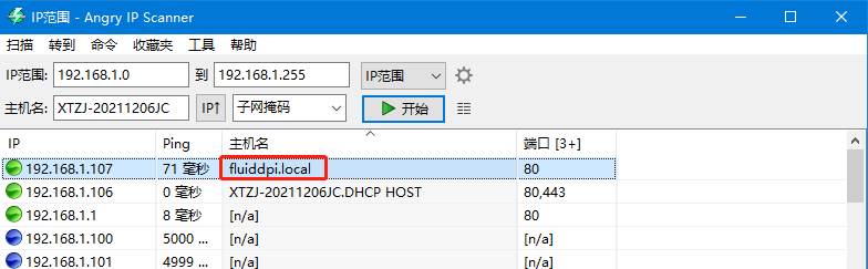 5、或者使用https://angryip.org/工具,扫描当前局域网下的所有IP地址,并使用主机名重新排序,找到主机名为Fluidd或者Mainsail的设备,如下图所示。