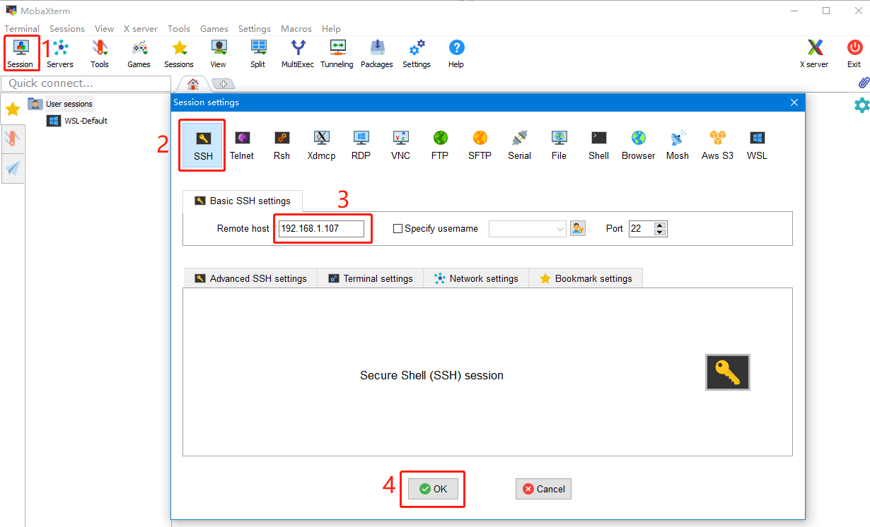 6、打开已经安装的Mobaxterm软件,点击“Session”,在弹出的窗口中点击“SSH”,在Remotehost一栏中输入树莓派的IP地址,点击“OK”(注意:电脑和树莓派必须要在同一个局域网下)。