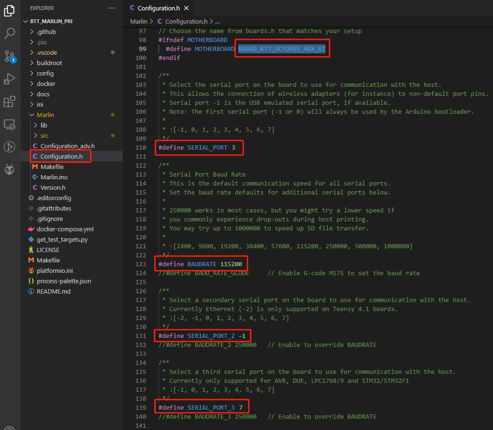 Marlin中只需设置正确的“SERIAL_PORT”和“BAUDRATE”即可。主板上ESP8266与Marlin通信的串口是UART3,所以将SERIAL_PORT设置为3。