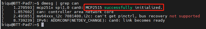 3.在ssh终端执行dmesg|grepcan命令,此时应该会有“MCP2515successfully initialized”的应答