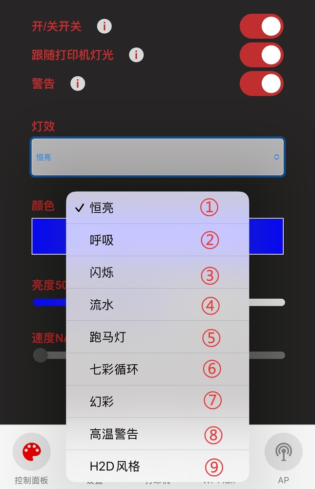 ⑨ 选择后,可以根据打印机调整灯光的颜色。您可以在打印中选择静态或彩虹照明效果。