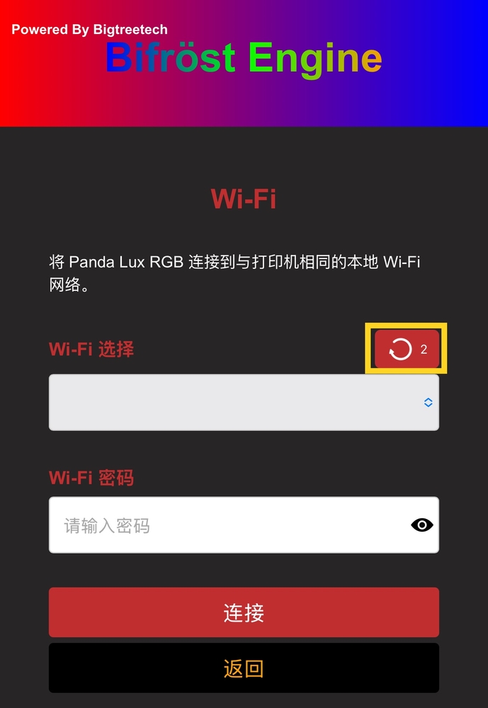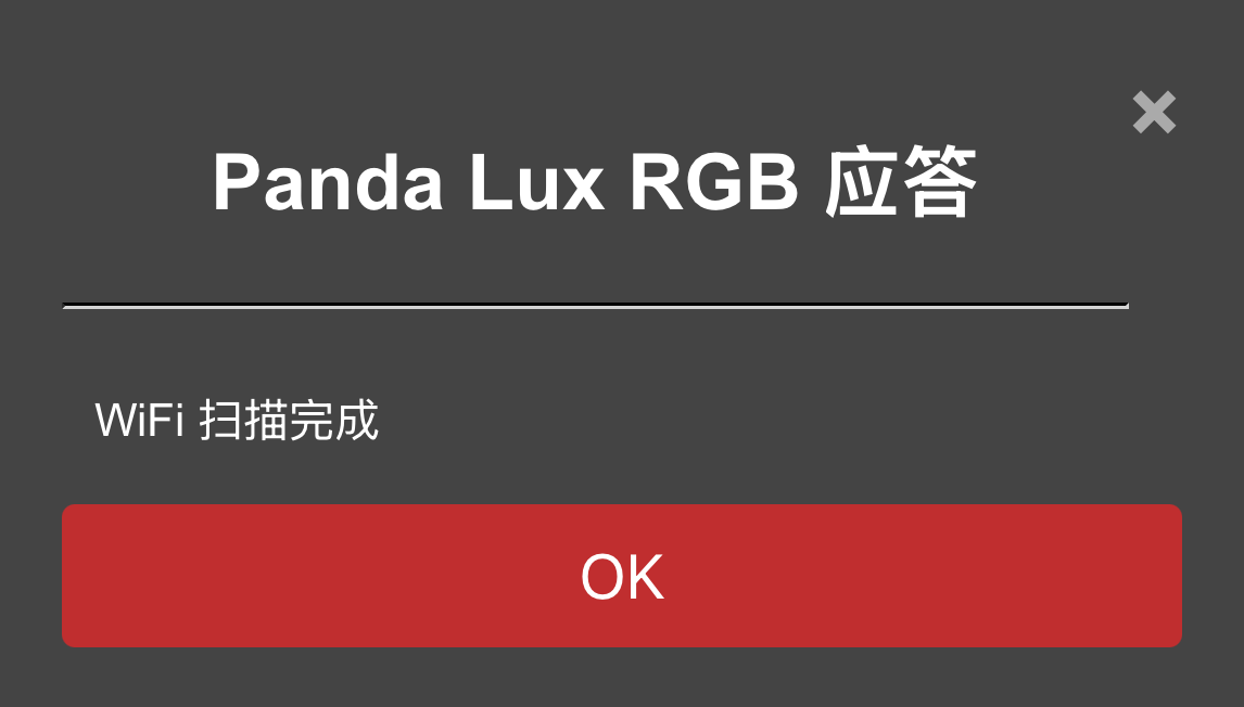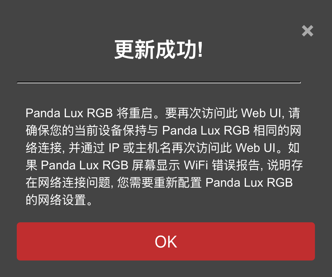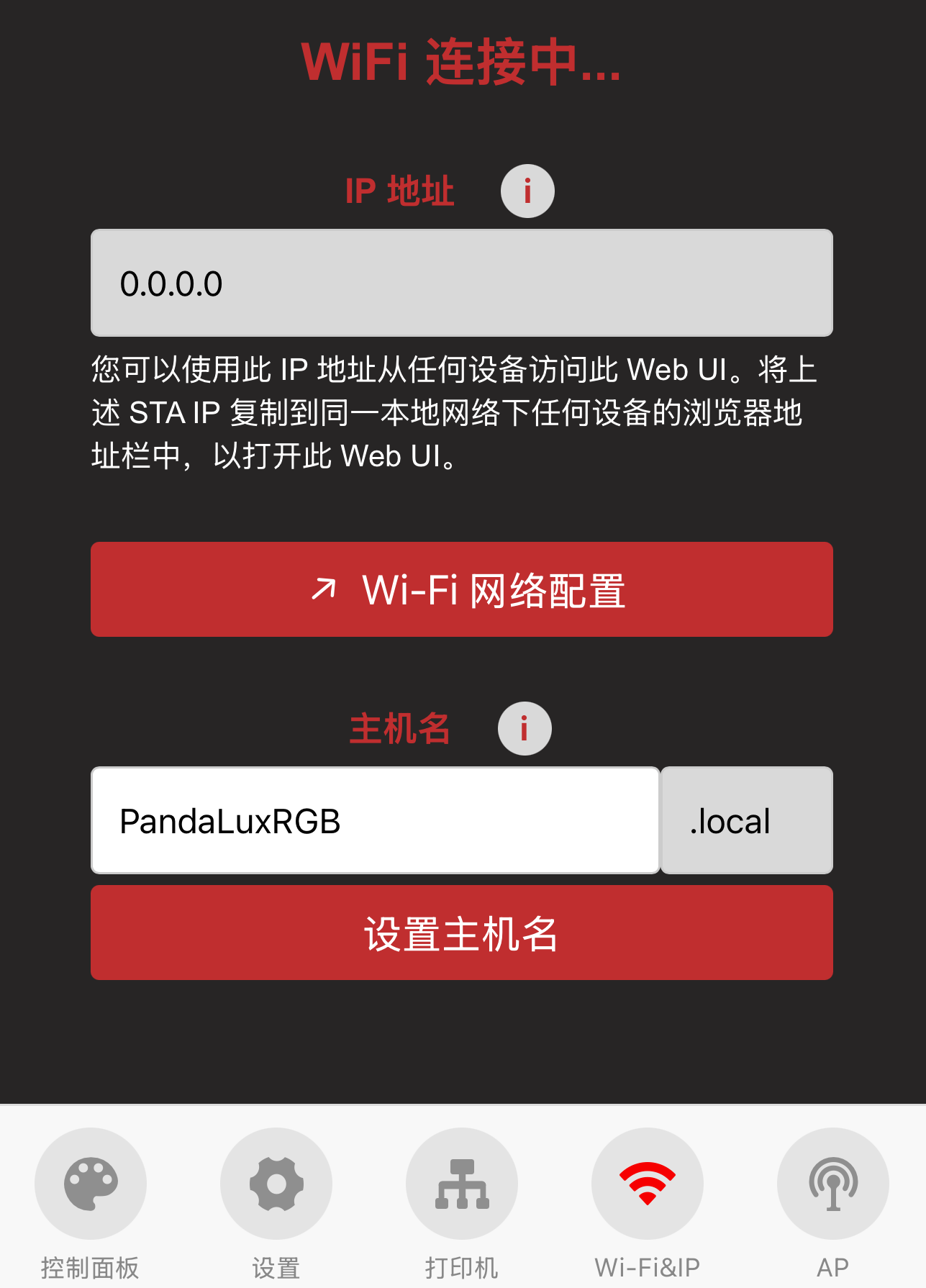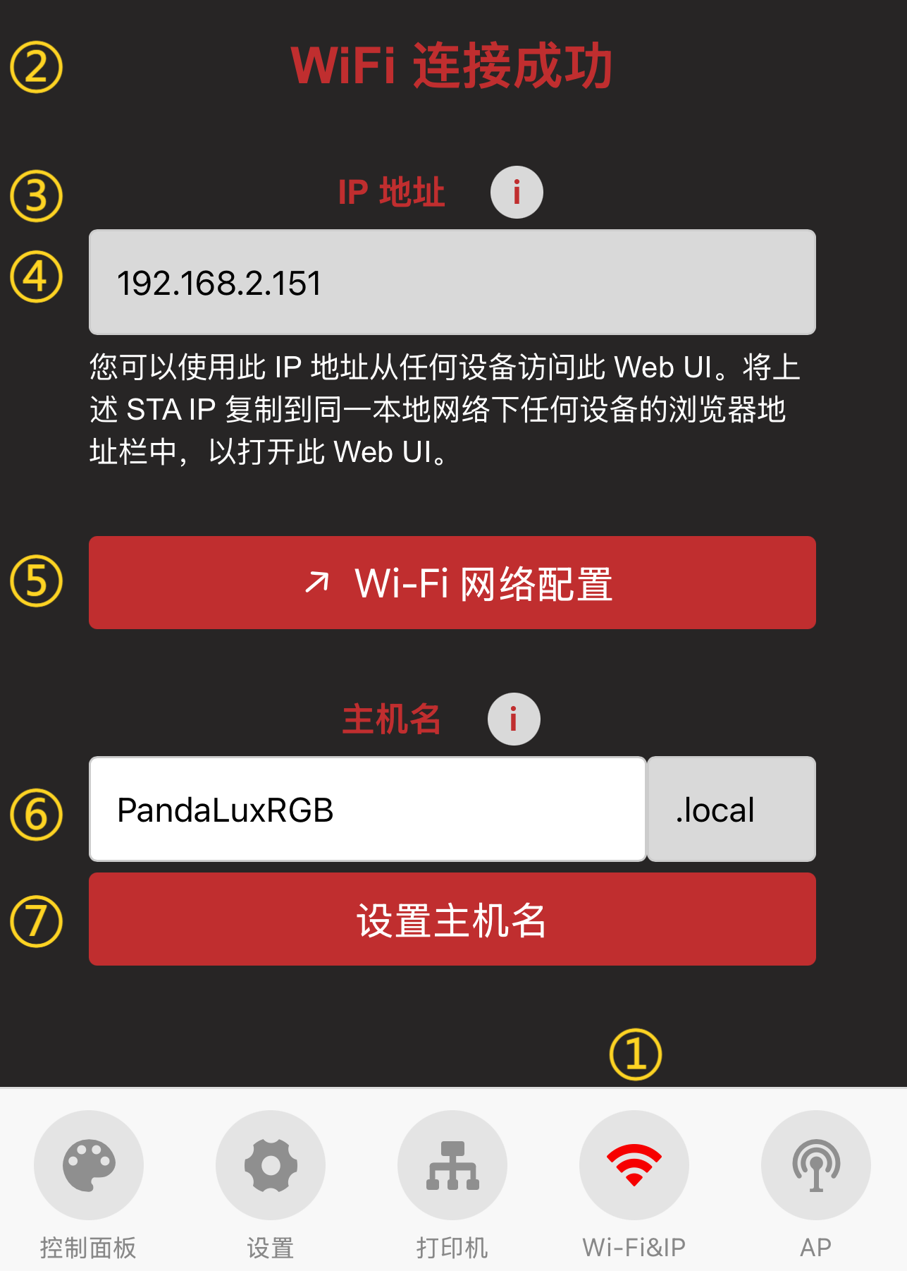 ⑥ 主机名显示,您可以使用主机名访问 Web UI。默认主机名为: PandaLuxRGB。如果您不记得 IP 地址,可以在浏览器地址栏中输入主机名加上 .local 访问 Web UI (例如: http://PandaLuxRGB.local)。点击文本框可以编辑主机名, 点击 设置主机名 按钮确认修改