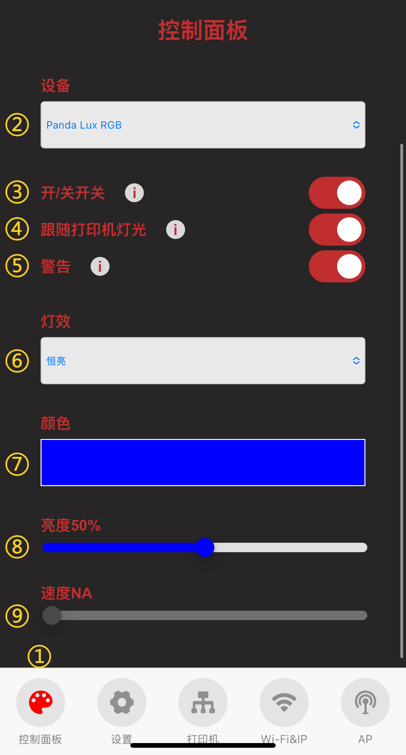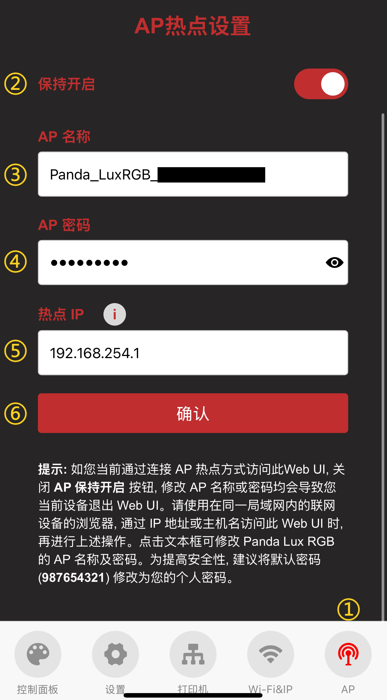 ⑤ 热点IP(默认的热点 IP 为: 192.168.254.1, 如果您自己路由器的 IP 号段也为 192.168.254.xxx, Panda Lux RGB PX 与路由器的 IP 号段相同就会产生冲突, 并且导致 Panda Lux RGB PX 无法正常绑定到打印机, 请手动修改 Panda Lux RGB PX 的热点 IP 使其与路由器使用不同的 IP 号段)