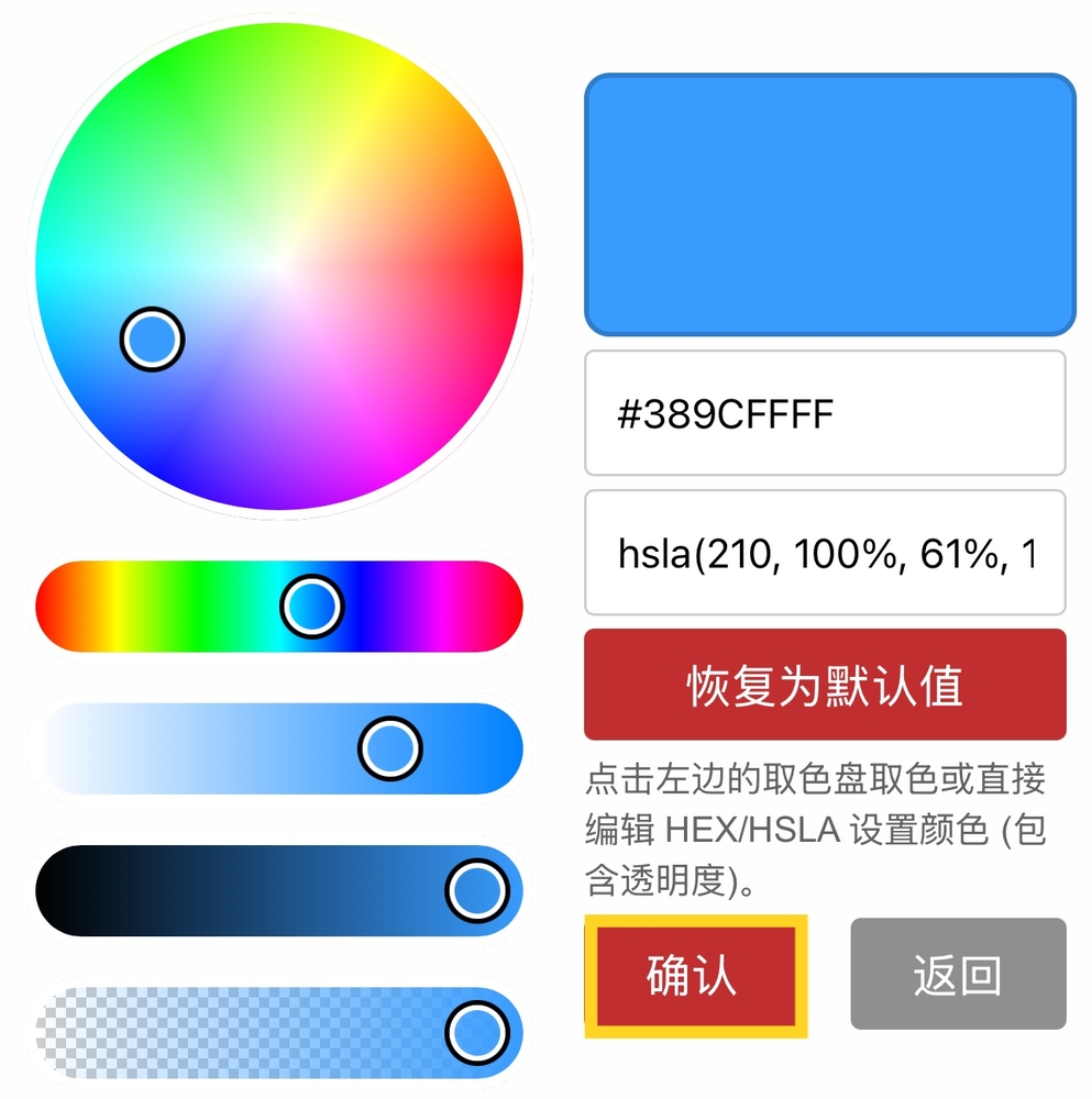 ② 自定义颜色。点击后会出现一个取色盘,可以设置此自定义颜色的颜色值