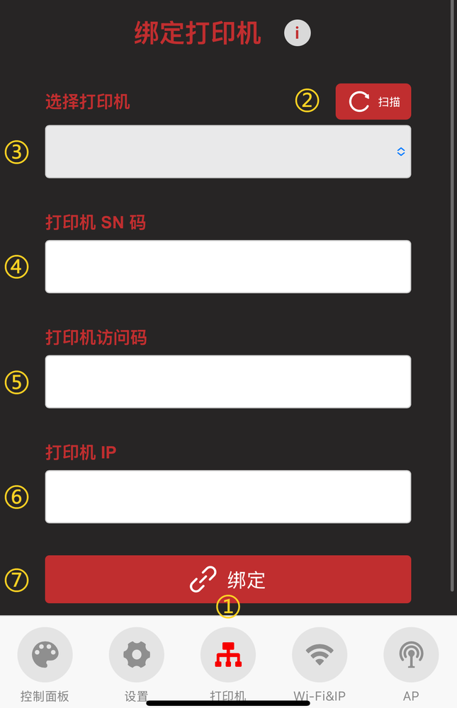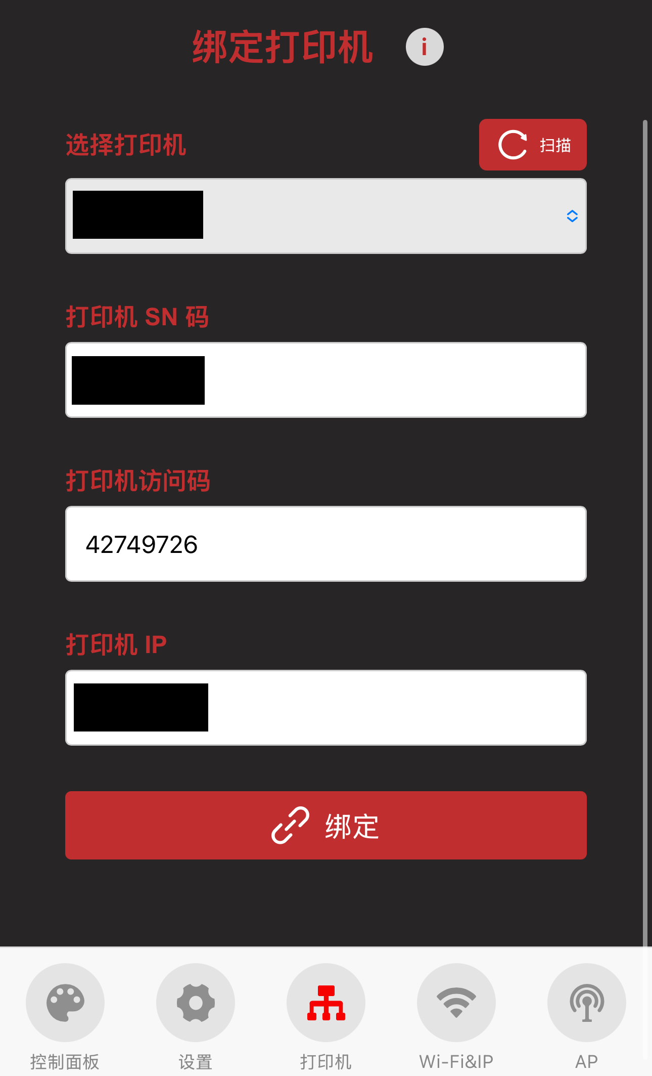 配对码输入到访问码框内,点击绑定即可开始绑定打印机。