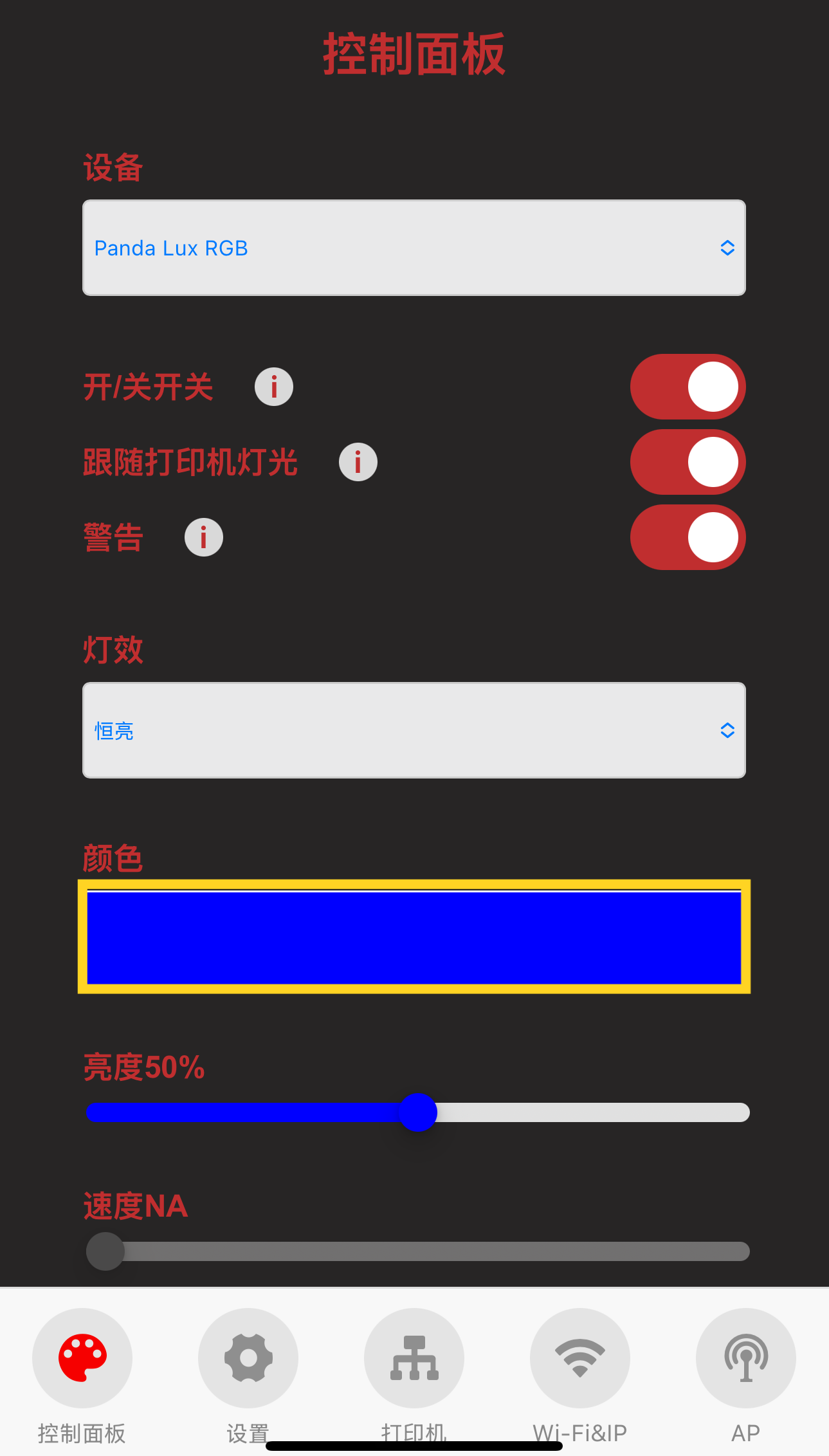 首次连接电源后或执行“恢复出厂设置”命令后,您将看到蓝色跑马灯,代表此时Panda_Lux_RGB PX 没有绑定打印机。