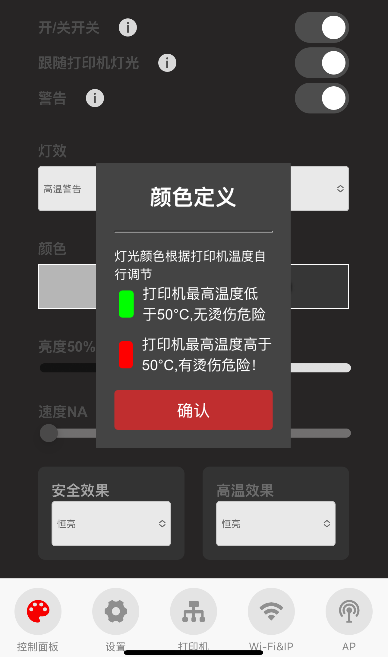 ⑧ 光线的颜色可以根据打印机的温度进行调整。您可以在“安全效果”和“危险效果”下选择两种照明效果,静态或闪光。
