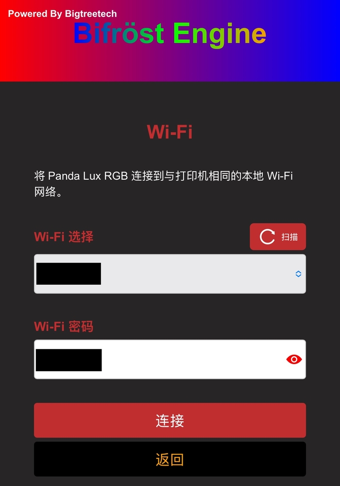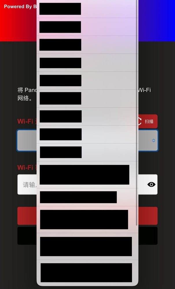首次出厂或恢复出厂设置后,进入此页面会自动扫描周围WiFi,或者手动点击扫描。