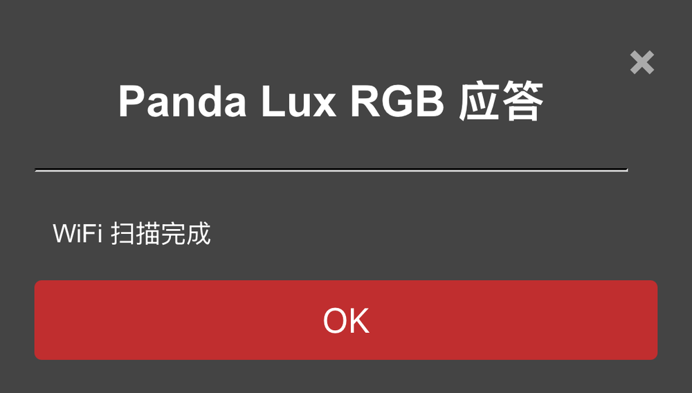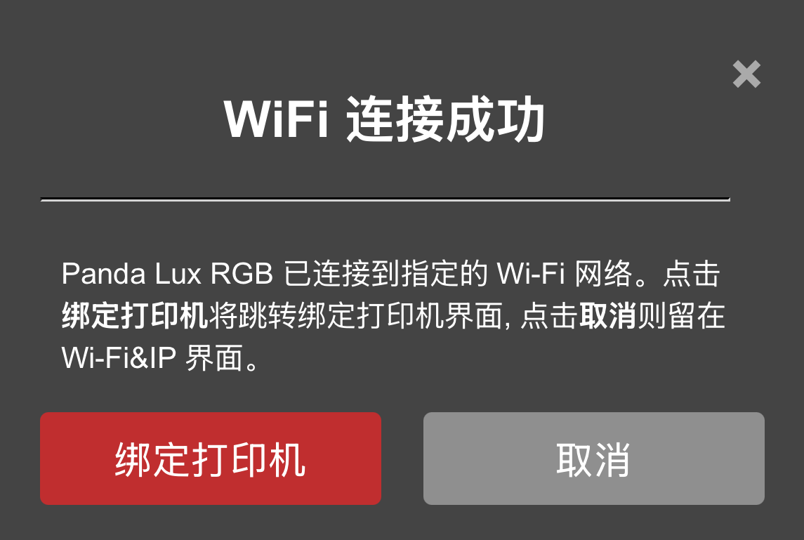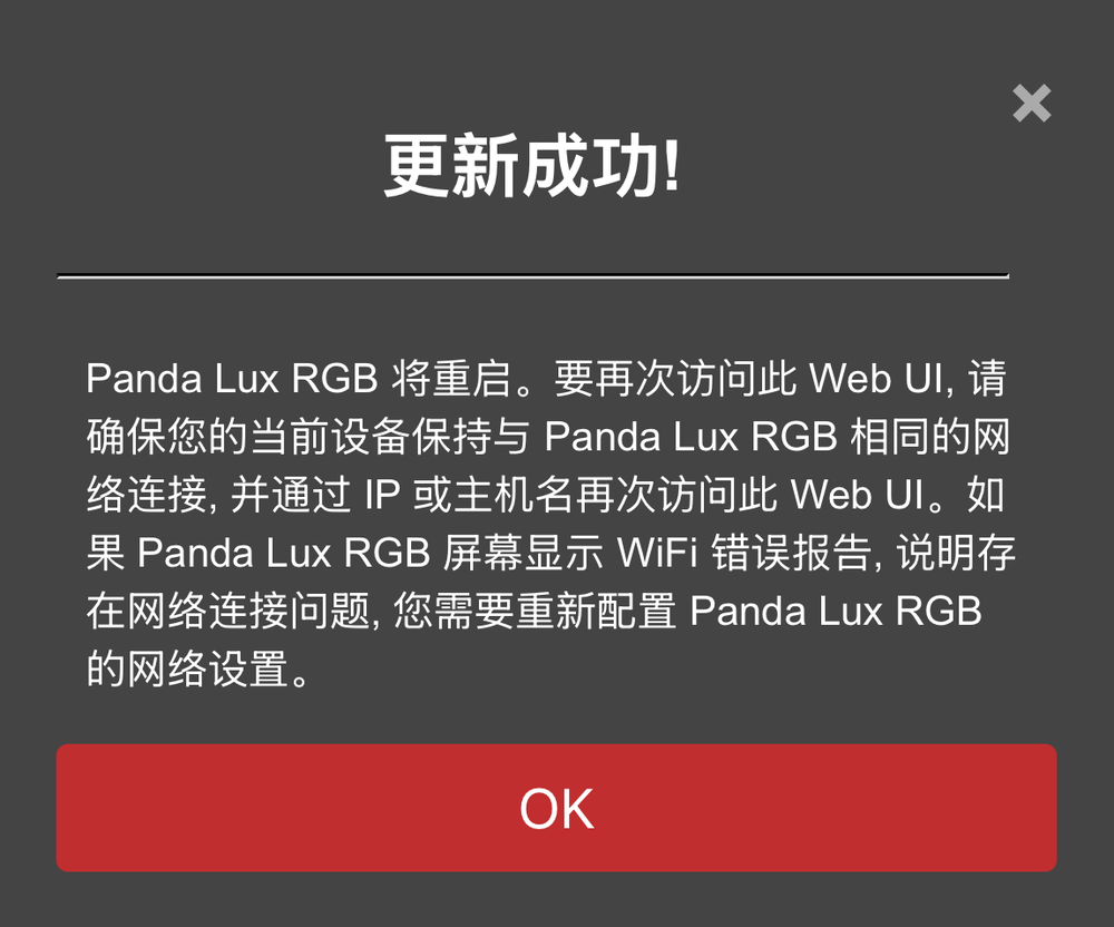 ③ IP地址的相关问题弹窗提示,如果 IP 地址 文本框未显示 IP, 请确保 Panda Lux RGB PX 网络状态显示为 连接成功。如果显示为 未连接, 请配置网络设置。