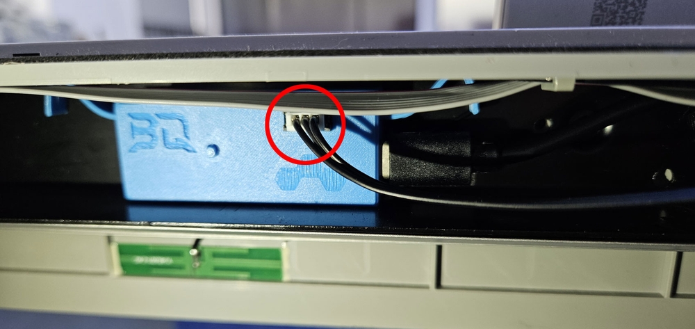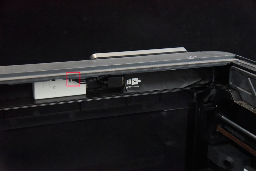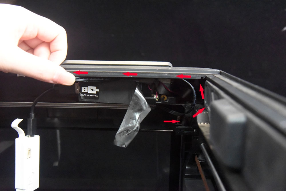 将打印机上的胶带部分取下,按照图示走线,将Panda LUX RGB PX的电源线引卡机器内部。