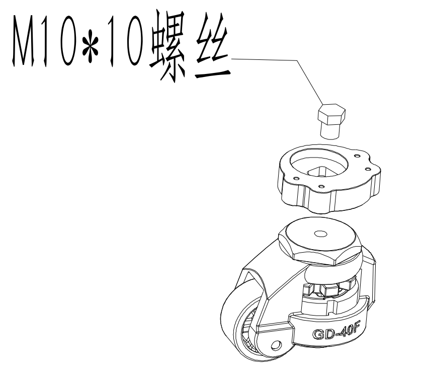 如图所示,使用 M10×10 螺丝将安装支架固定到万向轮上。