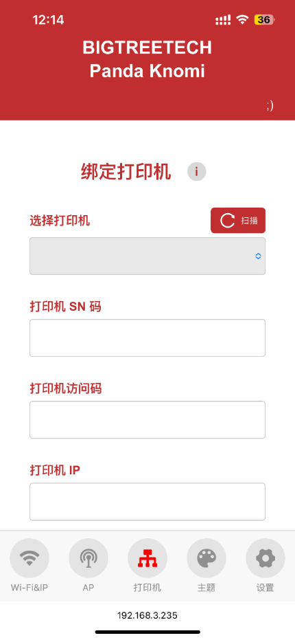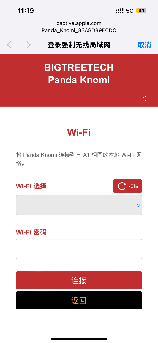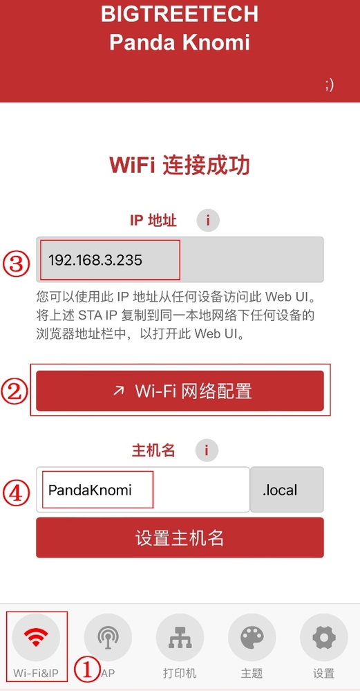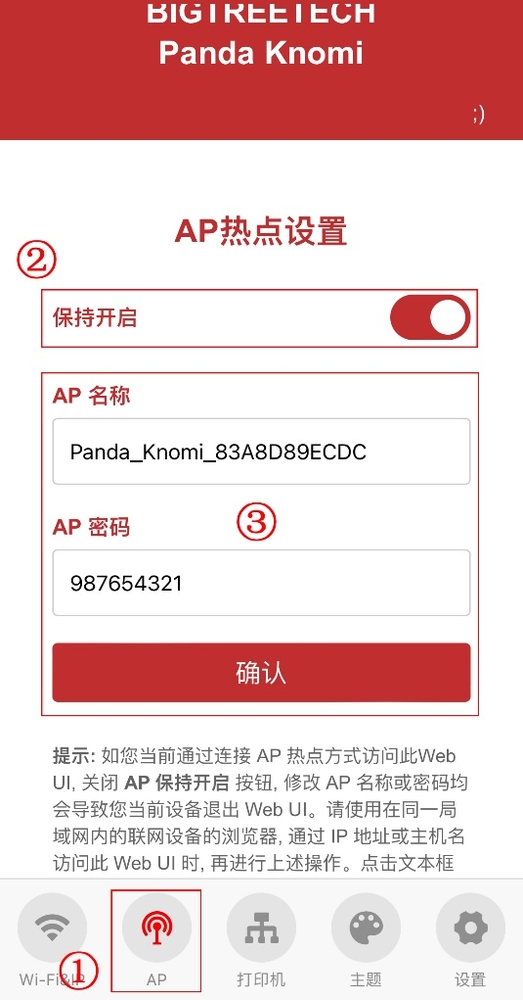 无效的IP,自动修正中,请使用Bambu Handy或Bambu Studio尝试控制打印机,如果打印机无应答或显示不在线,可能是打印机所处的网络环境异常,请检查网络环境。如果可以正常控制打印机,请尝试断电重启Panda Knomi,若重启后仍无法正常连接,请联系售后支持邮箱support01@bigtree-tech.com - 在设置界面连接Panda Knomi的AP热点后,直接跳转到的Web UI界面,部分手机由于权限的问题可能无法在此界面上传更新GIF图片、IMG文件和固件,请到浏览器中访问Web UI再进行此类上传文件的操作。