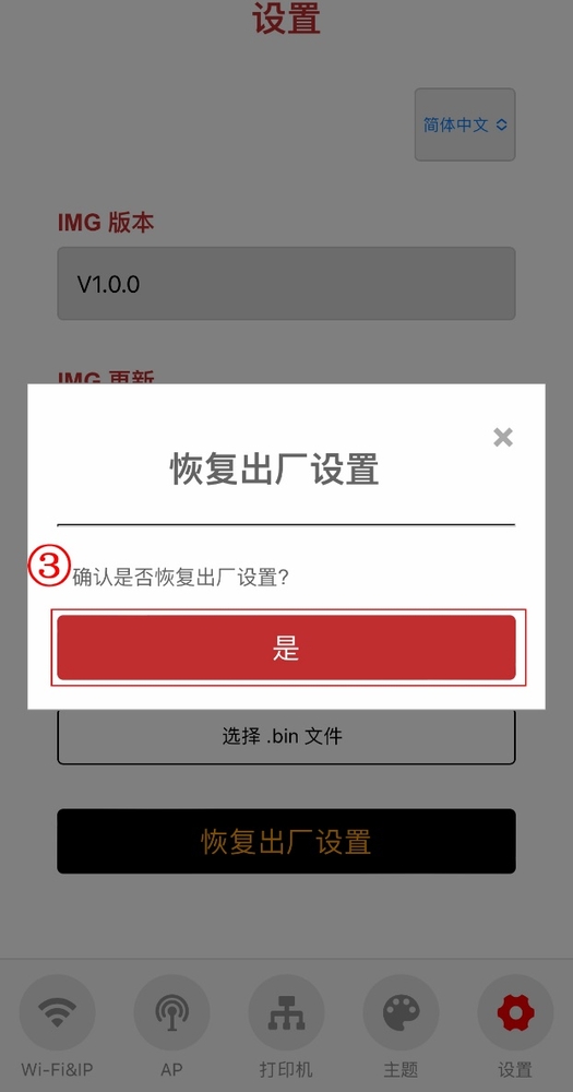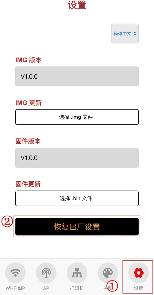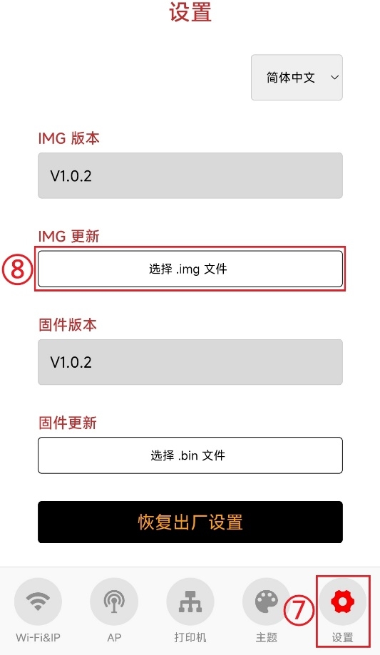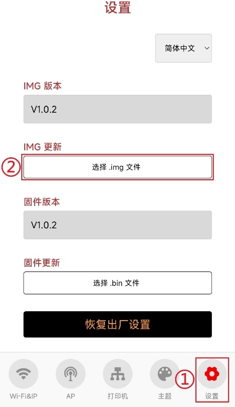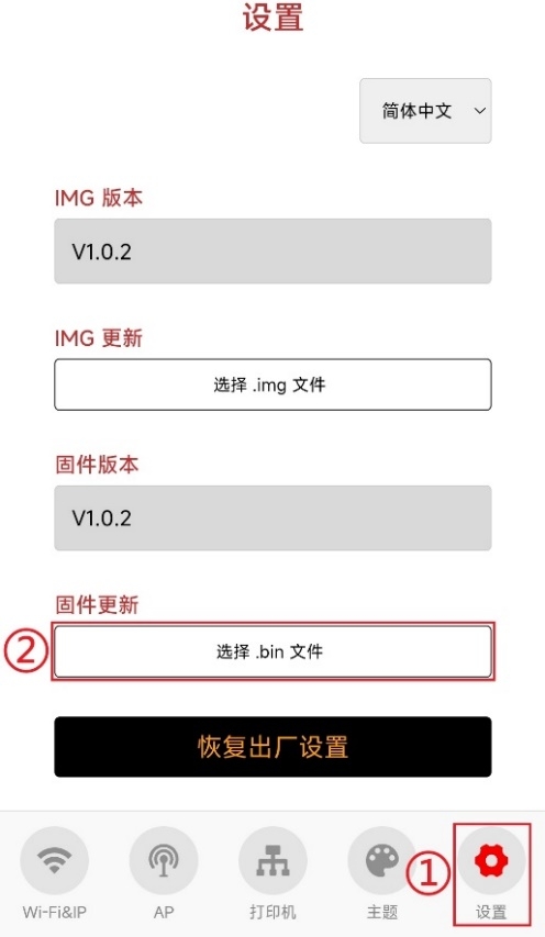 设置界面, 点击 ②选择 .bin 文件, 然后选择要更新的固件, 更新完成后设备会自动重启。