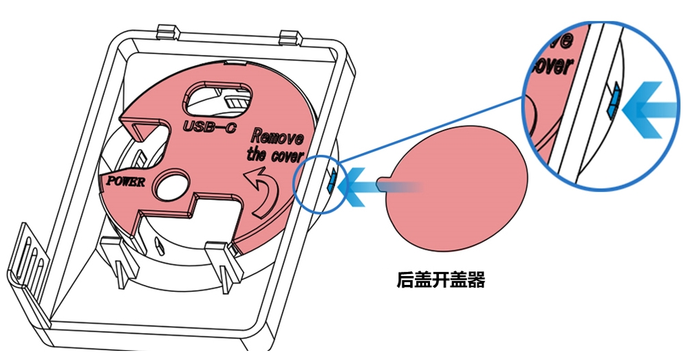 使用后盖开盖器顶住图示中蓝色高亮槽口的位置,后盖将自动弹开,便于取下。(您需要先从 GitHub 下载后盖开盖器的文件并自行打印)
