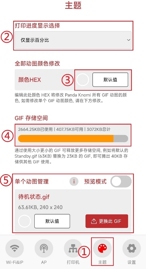Panda Knomi恢复出厂设置会清空所有的配置,包括语言、连接的WiFi、自定义的主机名、自定义的AP热点名称和密码、绑定的打印机、打印进度显示选择、主题配色信息。但是无法将自定义的GIF恢复为出厂GIF,GIF只能通过上传GIF或者更新IMG修改,出厂的IMG文件可从Panda Knomi的Github上面下载。