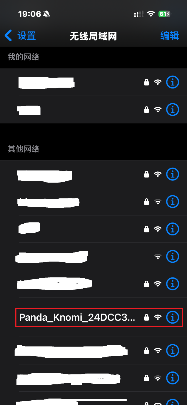 - 将设备连接到Panda Knomi的AP热点。以iPhone为例: